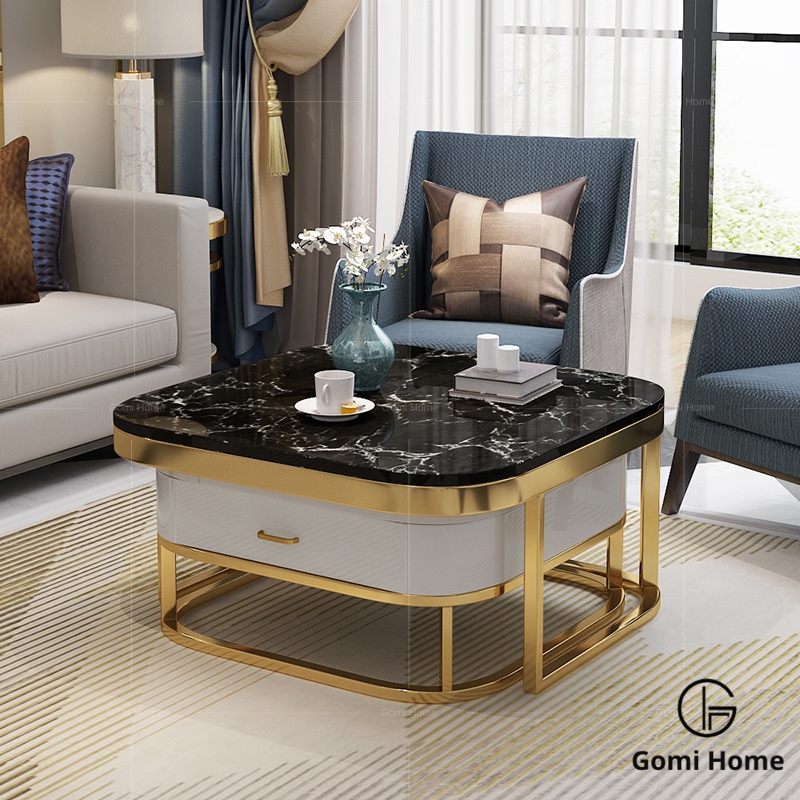 Thiết kế chân sắt tĩnh điện mạ vàng đồng làm thiết kế bắt mắt sang trọng hơn. Hộc bàn có ngăn kéo nhỏ giúp cất giữ đồ đạc ngăn nắp. Mặt bàn có thể thay các mặt đá khác nhau tuỳ chọn:
